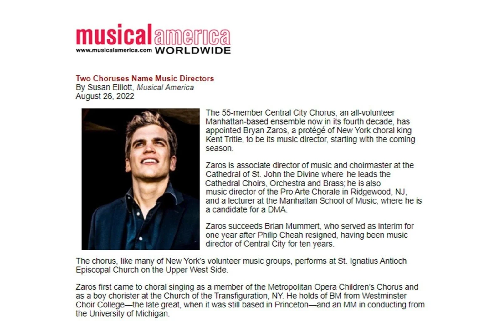 Musical America Worldwide announces the appointment of Bryan Zaros as new Music Director of Central City Chorus